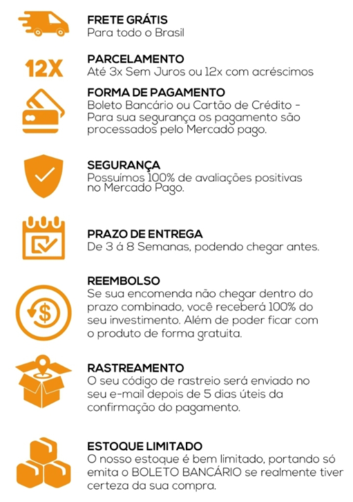 Atenção: O tempo estimado para entrega é de 7 á 15 dias úteis, pois nossos produtos chegam através dos Estados Unidos, Ásia e Europa.